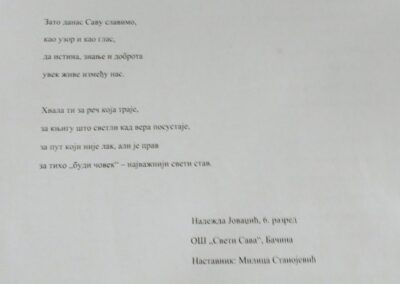 Центар за стручно усавршавање у Крушевцу, у сарадњи са Подружницом Друштва за српски језик и књижевност Расинског округа, организовао је Светосавски литерарни конкурс. Међу шездесет радова нашао се и рад наше ученице Надежде Јоваџић који је награђен 1.наградом.